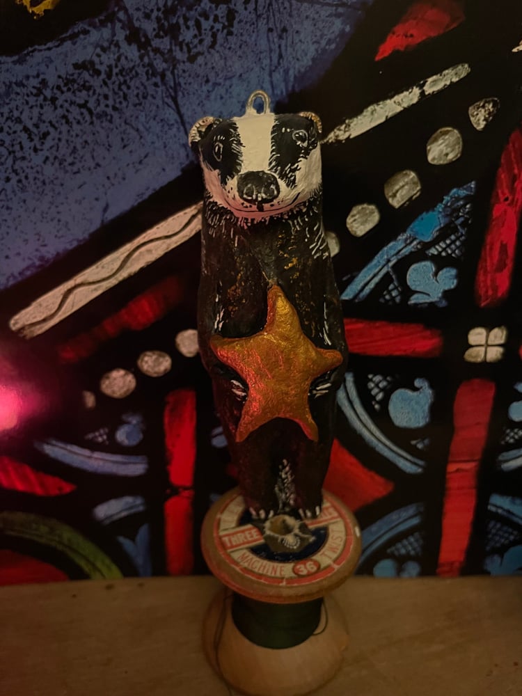 Made from paper clay and painted with acrylic paint. Buffed with a glimmer of gold and then sealed with acrylic varnish