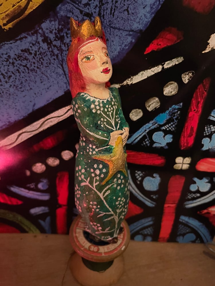 Painted in acrylic paint with a golden lustre buffed over. Sealed with acrylic varnish.