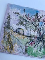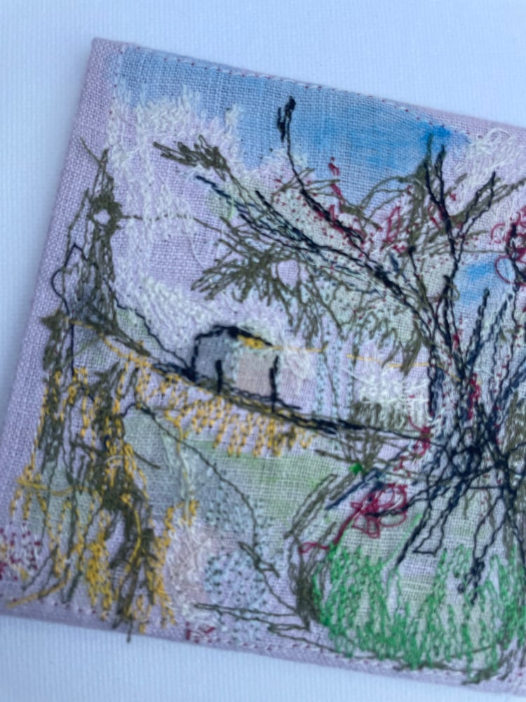 Machine sewn image onto pink linen. Watercolour colour wash in the background.